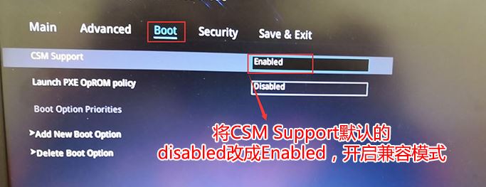 3、重启后切换到BOOT的选项,分别把fast boot和csm support由disabled改成enabled,分别开启快速启动和兼容模式;