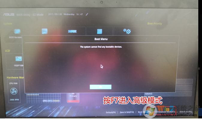 1、重启笔记本按esc进入BIOS设置,然后按F7进入高级模式,如下图所示;