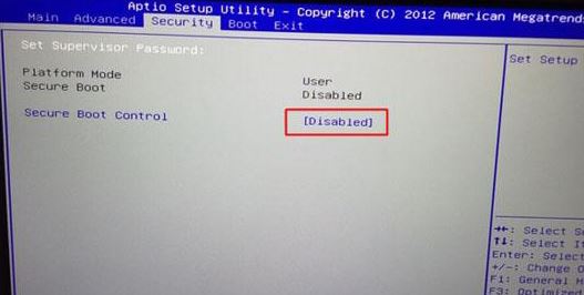 1、重启笔记本按F2进入BIOS设置,在Security下把Secure Boot Control设置为Disabled,如下图所示;