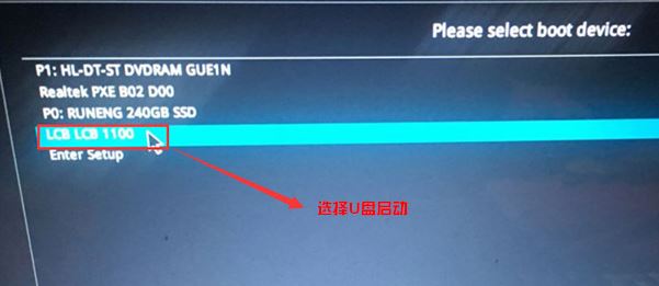 4、插入U盘启动盘,重启按ESC选择识别到U盘启动项,回车即可使用U盘启动,如图: