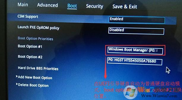 3、继续把boot option#1选项改为普通引导的,boot option#1和boot option#2硬盘启动位置对换,设置第一启动项为普通硬盘引导,带Windwos Boot Manager的为UEFI引导分区,然后按F10保存;