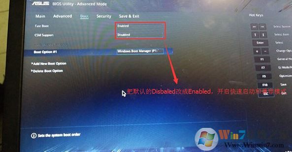 2、重启后切换到BOOT的选项,分别把fast boot和csm support由disabled改成enabled,分别开启快速启动和兼容模式;