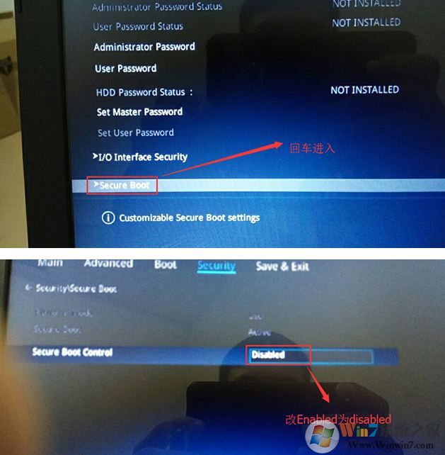 1、重启笔记本按esc进入BIOS设置,然后按F7进入高级模式,按→方向键移动到Security,选择Secure Boot,然后回车进入把Secure Boot control选enabled改为disabled关闭安全启动,然后按F10保存重启;