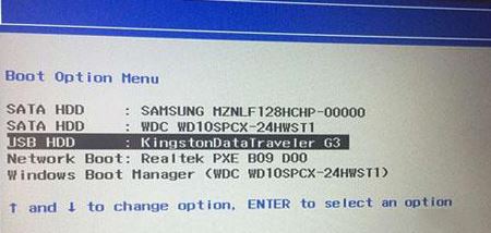 7、插入制作好的U盘启动盘,重启按F12或FN+F12调出启动管理对话框,选择USB HDD识别到U盘启动进入PE,回车;