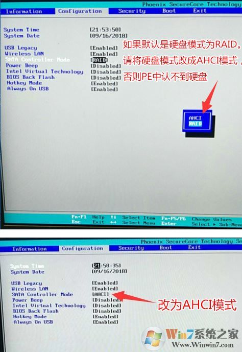 6、注意:如果默认硬盘模式为RAID,请将硬盘模式改为AHCI模式,否则进PE后不能认出硬盘,如下图所示;