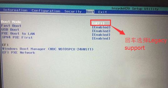 4、切换到Boot,把Boot Mode从UEFI改成Legacy Support;