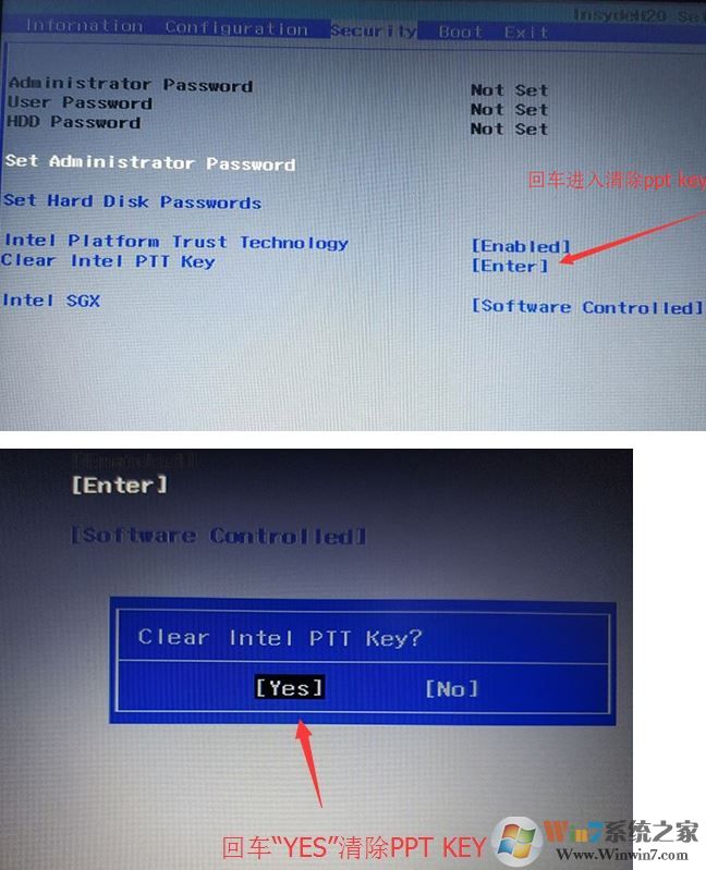 注:按如果Security选项下没有Secure Boot选项,看下是否有"clear intel PTT Key"选项,如果有进入回车选选择“yes”清除ppt key,否则无法安装系统后无法引导启动,如下图所示;