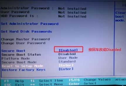 1、开机一直按F2或(FN+F2)进入BIOS,按→方向键切换到Security,选择Secure Boot回车设置成Disabled;