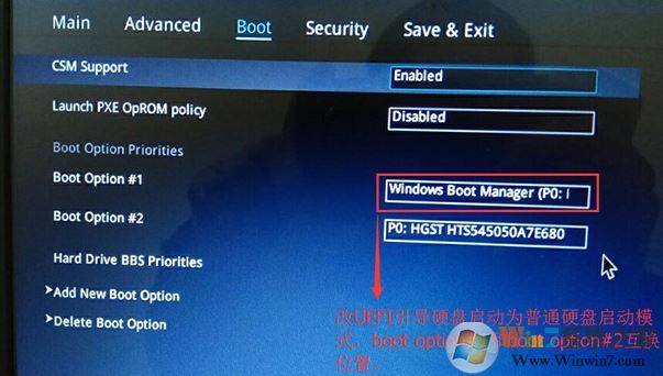 3、继续把boot option#1选项改为普通引导的,boot option#1和boot option#2硬盘启动位置对换,设置第一启动项为普通硬盘引导,带Windwos Boot Manager的为UEFI引导分区;
