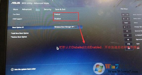 2、重启后切换到BOOT的选项,分别把fast boot和csm support由disabled改成enabled,分别开启快速启动和兼容模式;