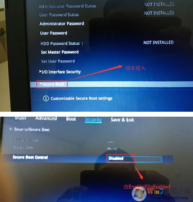 1、重启笔记本按esc进入BIOS设置,然后按F7进入高级模式,按→方向键移动到Security,选择Secure Boot,然后回车进入把Secure Boot control选enabled改为disabled关闭安全启动,然后按F10保存重启;