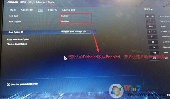 2、重启后切换到BOOT的选项,分别把fast boot和csm support由disabled改成enabled,分别开启快速启动和兼容模式;