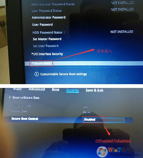 1、重启笔记本按esc进入BIOS设置,然后按F7进入高级模式,按→方向键移动到Security,选择Secure Boot,然后回车进入把Secure Boot control选enabled改为disabled关闭安全启动,然后按F10保存重启;