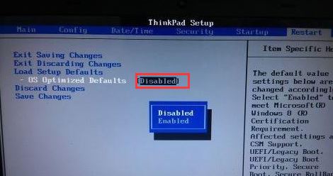 4、在Restart下,选择OS Optimized Defaults回车,改成Disabled或Other OS,接着选择Load Setup Defaults回车进行加载,然后按F10保存设置。