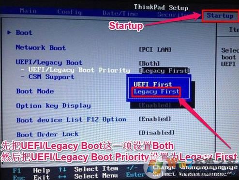 3、选择startup,在UEFI/legac boot priority下,设置为Legacy First(传统模式优先)。