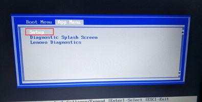 1、重启笔记本按F12,按TAB键切换栏目到"App Menu",然后选择"setup"进入BIOS设置,或是看到lenovo或ThinkPad标识后多次按Enter回车,听到报警声后等待下一画面,然后按F1或Fn+ F1进入BIOS主界面。如下图所示;
