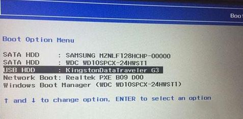 6、插入制作好的U盘启动盘,重启按F12或FN+F12调出启动管理对话框,选择USB HDD识别到U盘启动进入PE,回车进入PE: