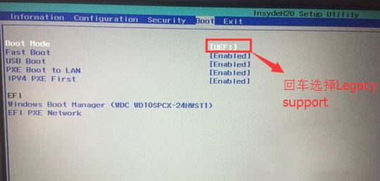 4、切换到Boot,把Boot Mode从UEFI改成Legacy Support;