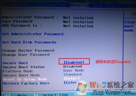 1、开机一直按F2或(FN+F2)进入BIOS,按→方向键切换到Security,选择Secure Boot回车设置成Disabled,如下图所示;