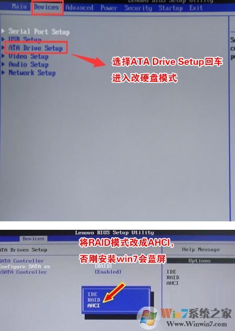 4、切将键盘移动Devices选项,把键盘移动ATA Drive Setup回车,将configure SATA as中默认的raid改成ahci模式,否则安装win7时会出现0x0000007b蓝屏,因为win7中没有集成raid硬盘驱动,然后选择F10保存设置,在弹出的选项中选择YES,如下图所示;