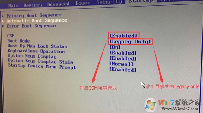 3、切换到Boot,把Boot Mode从UEFI改成Legacy only引导模式,再把csm默认disabled改成enabled,开启兼容模式;