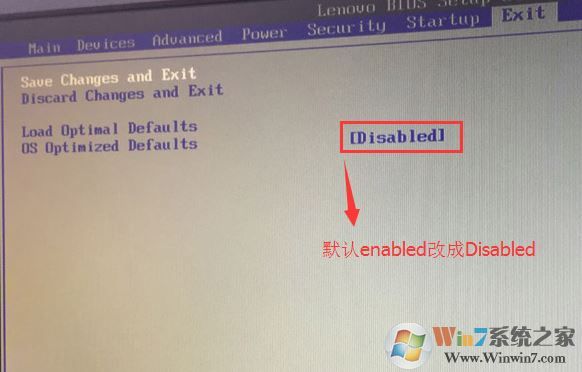 2、转到Exit,把OS Optimized Defaults设置为Disabled;