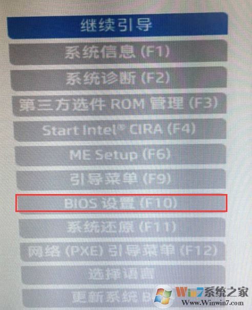 1、开机一直按按ESC,出现以下界面后,再按F10进入BIOS,如下图所示;