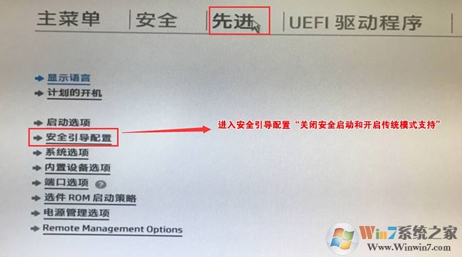 2、进入BIOS后,将移动键盘到“先进”选项下,选择"安全引导配置",按回车键进入设置;
