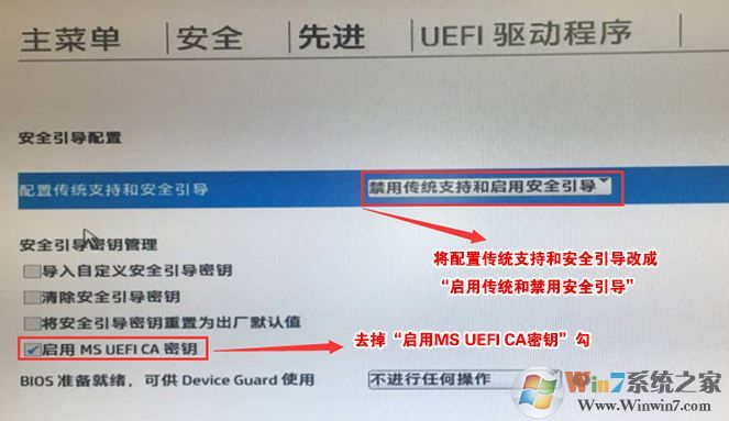 3、回车后,将配置传统支持和安全引导设置电脑“启用传统支持和禁用安全引导”以及去掉“启用MS UEFI CA密钥”前面的勾,然后按F10保存更改;