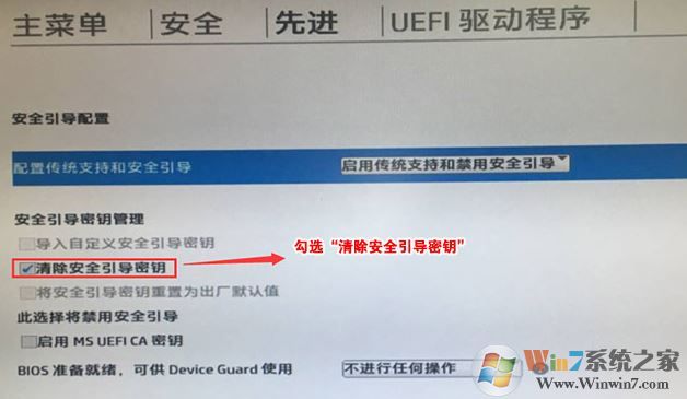 4、F10保存重启后再次开机按ESC,然后选择F10进入BIOS设置,将进入刚设置的地方,勾选“清除安全引导密钥”,然后再次F10保存;