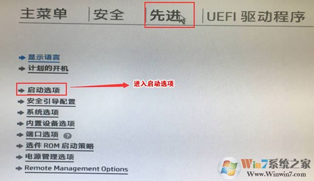 5、F10保存重启后再次开机按ESC,然后选择F10进入BIOS设置,将鼠标移动“先进”选项中,选择"启动选项"后回车进入,如下图所示;