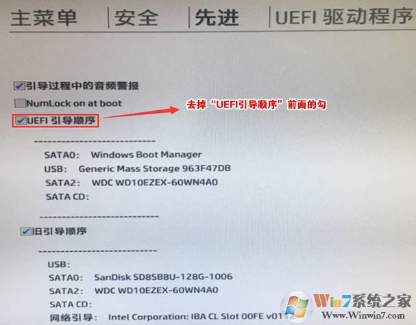 6、进入后将UEFI顺序前面的勾去掉,让机器默认为传统启动,这样方便安装WIN7,如下图所示;