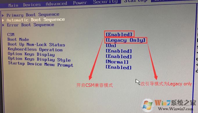 3、切换到Boot,把Boot Mode从UEFI改成Legacy only引导模式,再把csm默认disabled改成enabled,开启兼容模式,选择F10保存设置,在弹出的选项中选择YES;