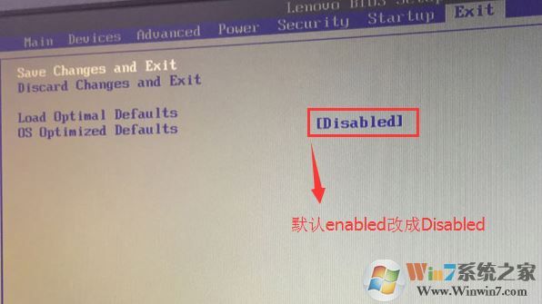 2、转到Exit,把OS Optimized Defaults设置为Disabled;
