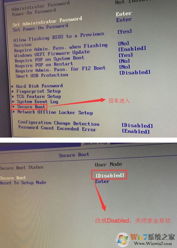 1、开机一直按F2或(FN+F2)进入BIOS,按→方向键切换到Security,选择Secure Boot回车设置成Disabled;