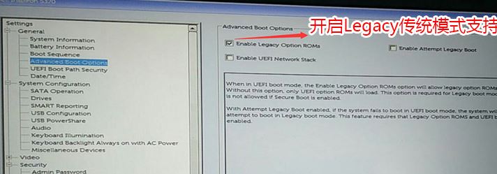 3、切换到Advanced Boot Options将右边的Enable legacy option roms选项打勾,如图: