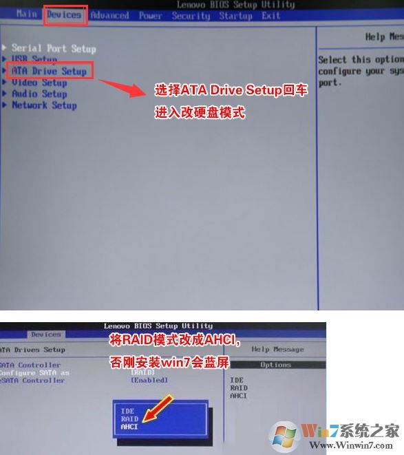 4、切将键盘移动Devices选项,把键盘移动ATA Drive Setup回车,将configure SATA as中默认的raid改成ahci模式,否则安装win7时会出现0x0000007b蓝屏,因为win7中没有集成raid硬盘驱动,然后选择F10保存设置,在弹出的选项中选择YES,如下图所示;