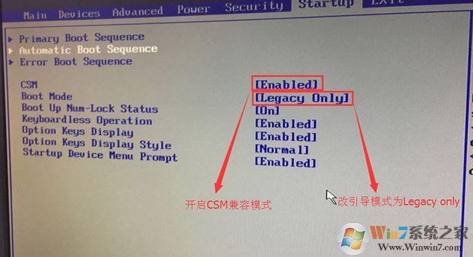 3、切换到Boot,把Boot Mode从UEFI改成Legacy only引导模式,再把csm默认disabled改成enabled,开启兼容模式;