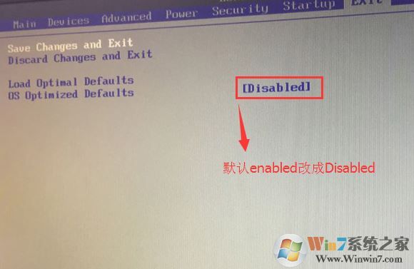 2、转到Exit,把OS Optimized Defaults设置为Disabled;