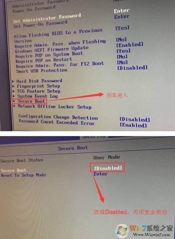 1、开机一直按F2或(FN+F2)进入BIOS,按→方向键切换到Security,选择Secure Boot回车设置成Disabled;