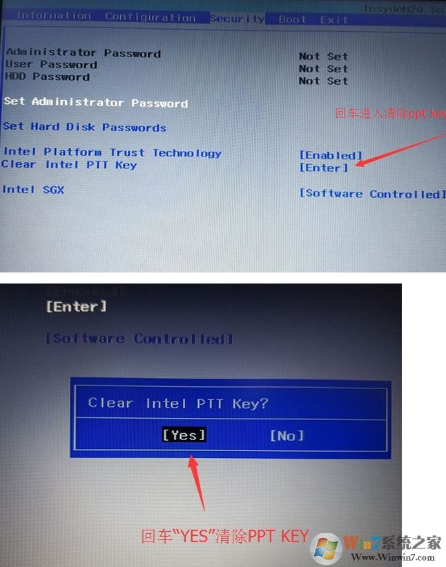 注:按如果Security选项下没有Secure Boot选项,看下是否有"clear intel PTT Key"选项,如果有进入回车选选择“yes”清除ppt key,否则无法安装系统后无法引导启动,如下图所示;