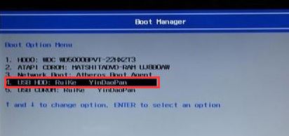 5、插入U盘启动盘,重启时不停的按下f12,打开Boot Manager,选择USB HDD回车从U盘启动,如下图所示;
