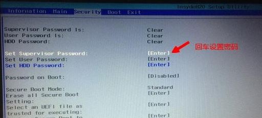2、如果Secure Boot灰色无法设置,则转到Security,选择Set Supervisor Password回车设置密码,再返回BOOT选项,将Secure BOOT默认enabled为disabled,(注:改完secure boot后再设置密码为空即可,要不每次进BIOS都要设置)如下图所示;