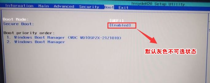 1、开机一直按F2进入BIOS,按F2进入BIOS界面,选择BOOT项后发现secure boot灰色不可选状态,如下图所示;