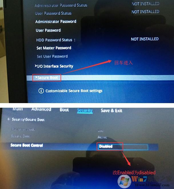 1、重启笔记本按esc进入BIOS设置,然后按F7进入高级模式,按→方向键移动到Security,选择Secure Boot,然后回车进入把Secure Boot control选enabled改为disabled关闭安全启动,然后按F10保存重启;