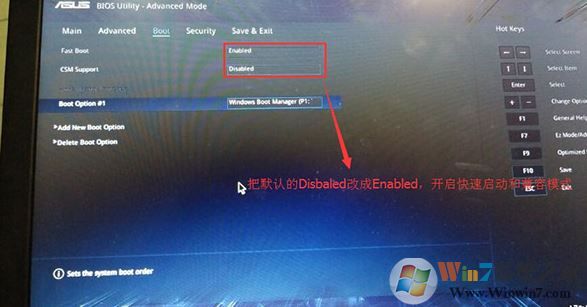 2、重启后切换到BOOT的选项,分别把fast boot和csm support由disabled改成enabled,分别开启快速启动和兼容模式;