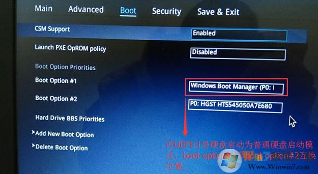 3、继续把boot option#1选项改为普通引导的,boot option#1和boot option#2硬盘启动位置对换,设置第一启动项为普通硬盘引导,带Windwos Boot Manager的为UEFI引导分区;