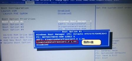 在“boot”中找到“boot option #1“按回车键,即可找的到U盘,用键盘方向键将U盘移动到第一个位置