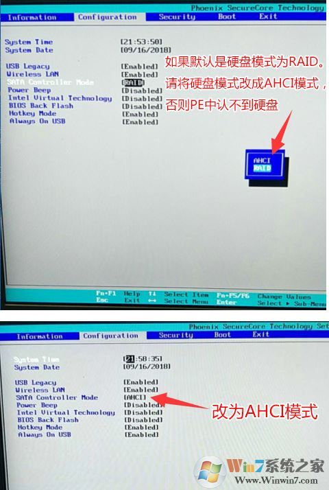 6、注意:再返回configuration这项,查看sata controller mode这项,如果默认硬盘模式为RAID,请将硬盘模式改为AHCI模式,否则进PE后不能认出硬盘,如果更改后记得按F10保存,如下图所示;