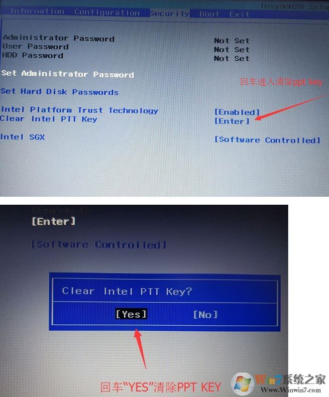 注:按如果Security选项下没有Secure Boot选项,看下是否有"clear intel PTT Key"选项,如果有进入回车选选择“yes”清除ppt key,否则无法安装系统后无法引导启动,如下图所示;
